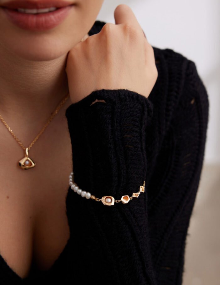 This bracelet is made of high-quality $925 silver and features natural pearls, showing the charming luster and elegance of antique gold and white gold. The bracelet chain is about 16cm long and comes with a 3cm extension chain, suitable for different wrist sizes. The pearls are about 5.5mm and 6mm respectively, and the chain width is about 11mm. The design is exquisite and highlights the sense of quality.